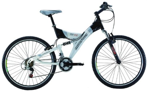 The SX4.0 is a MTB Shimano 21 speed bike with full suspension, a steel frame and 36h alloy rims. Bike comes in matte black. FRAME: 26 inch MTB Steel Full Suspension; SIZE: 19.68 inches; FORK: Steel Spring Pressure Suspension; DERAILLEUR: Shimano RD-TZ40; SHIFTERS: Shimano; CRANKSET: Alloy 24/34/42T; FREEWHEEL: SHIMANO 7-SPD; BRAKE LEVERS: Alloy; BRAKES: Alloy V-Brake; HANDLE BARS: Alloy; STEM: Alloy; SEAT POST: Alloy; HUBS: Alloy 36H; RIMS: Alloy Flame Treated Double Wall; TIRES: Black 26 inch x 1.95 inch.